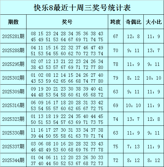 福彩隆盛8第2025344期(上周三)开奖追念:01 04 06 11 12 20 23 26 30 33 37 40 44 50 52 53 67 68 72 73,其中奖号奇偶比为8:12,大小比为8:12,012路比为5:7:8,首尾间距为72。